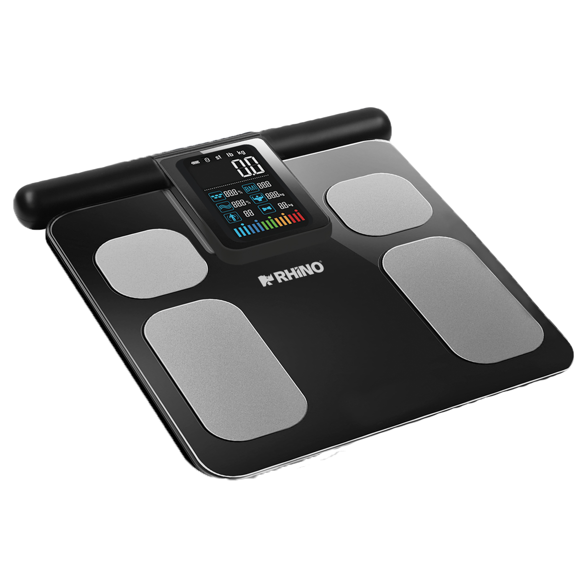 La báscula Rhino BIOMA-180 te permite obtener un análisis completo de la composición corporal, incluyendo grasa corporal, masa muscular, masa ósea y agua corporal. Gracias a su diseño ergonómico con barra de electrodos retráctil y pantalla LCD integrada, ofrece resultados más cómodos y visibles a la altura de los ojos.